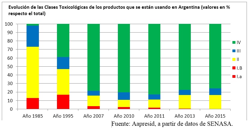 Si observamos la evolución de las clases toxicológicas de los productos que se están usando en Argentina (cuadro) podemos observar el crecimiento de productos banda verde (menor toxicidad):