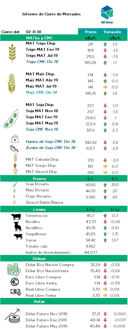 “Los contratos de soja avanzaron cerca de 1 U$S/tn, en un escenario dominado por renovado optimismo en torno a posible acercamiento entre EE.UU. y China. Recordamos que en el día de ayer, los mandatarios de ambos países mantuvieron una conversación telefónica y mostraron intenciones de retomar las negociaciones. Se estima que podrían mantener una reunión en el encuentro del G20, este mes en Argentina”, informó Grimaldi Grassi.