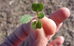 En período de plántula los cotiledones tienen una longitud de entre 10-12 mm y son peciolados. La lámina es anchamente ovada u oval, con el ápice muy emarginado y sin pelo. Las primeras hojas se caracterizan por ser alternas, con pecíolo corto, grueso y sin pelos (glabro). Lámina anchamente elíptica, muy pilosa (áspera al tacto).
