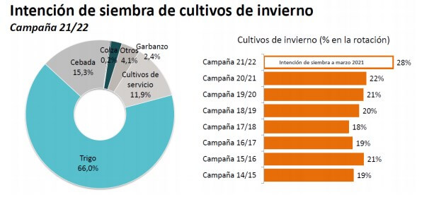 El informe difundido por la entidad indica que, en agricultura, “al evaluarse las intenciones de siembra de la campaña 2021/22, se planea un incremento de la participación de los cultivos de invierno en la rotación, cercana al 28%, lo supera las perspectiva respecto de años anteriores al igual momento del año”. Por otra parte, hay un 12% del área prevista que se destinará a los cultivos de servicio.
