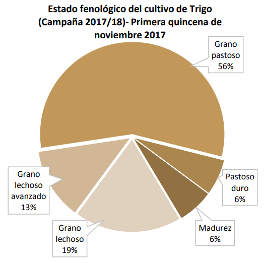 En detalle: El 59% de los trigos presentan una condición entre “Excelente” y “Muy Bueno”, el 32% está “Bueno” y el 9% restante, “Regular”. Fenológicamente, el ciclo del cultivo se encuentra en sus etapas finales, estando el 62% en el estadio “Grano pastoso” a “Pastoso duro”, un 32% se presenta en “Grano lechoso” a “Grano lechoso avanzado” y el 6% restante están en “Madurez”.