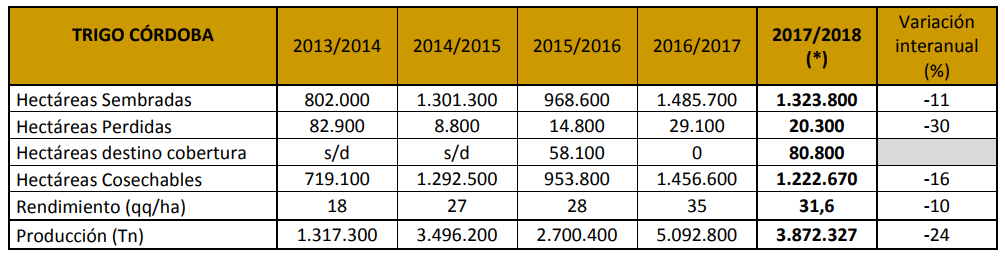 Según el informe de la Bolsa de Cereales de Córdoba, “la primera estimación de producción para la campaña 2017/18 de trigo arroja un valor de 3,8 millones de toneladas, un 24% inferior a lo obtenido la campaña anterior pero la segunda más alta en los últimos 10 años”.