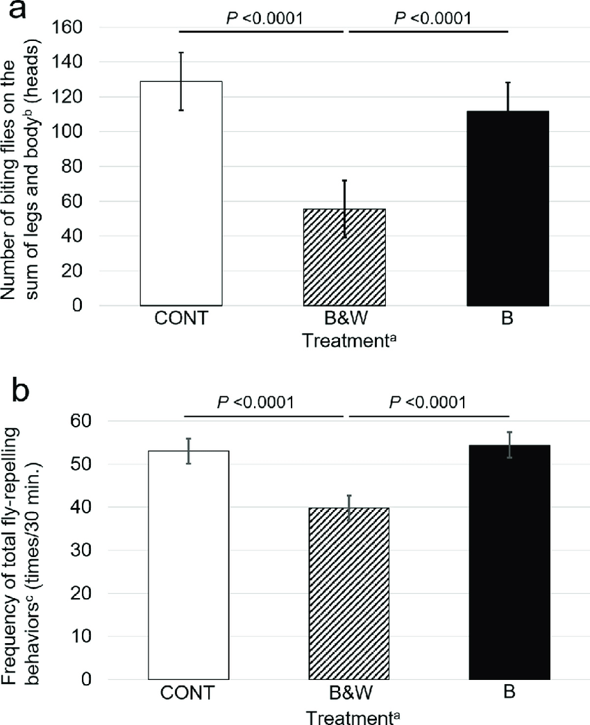 En base a los resultados se observo que, en las vacas con el patrón de rayas (B&W Treatment) el número de insectos contabilizados alrededor fue menos de la mitad del registrado en las vacas sin pintar (control) y menos que en las vacas con pintura negra (gráfico a).