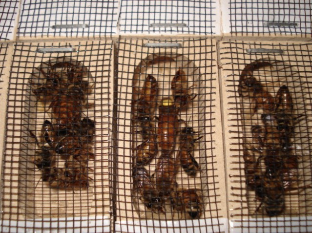 Por último, las abejas reinas se colocan en jaulitas individuales y estas en un contenedor con abejas nodrizas o bien en jaulitas junto a abejas nodrizas, ambas con abastecimiento de candy como alimento básico hasta que lleguen a la colmena.