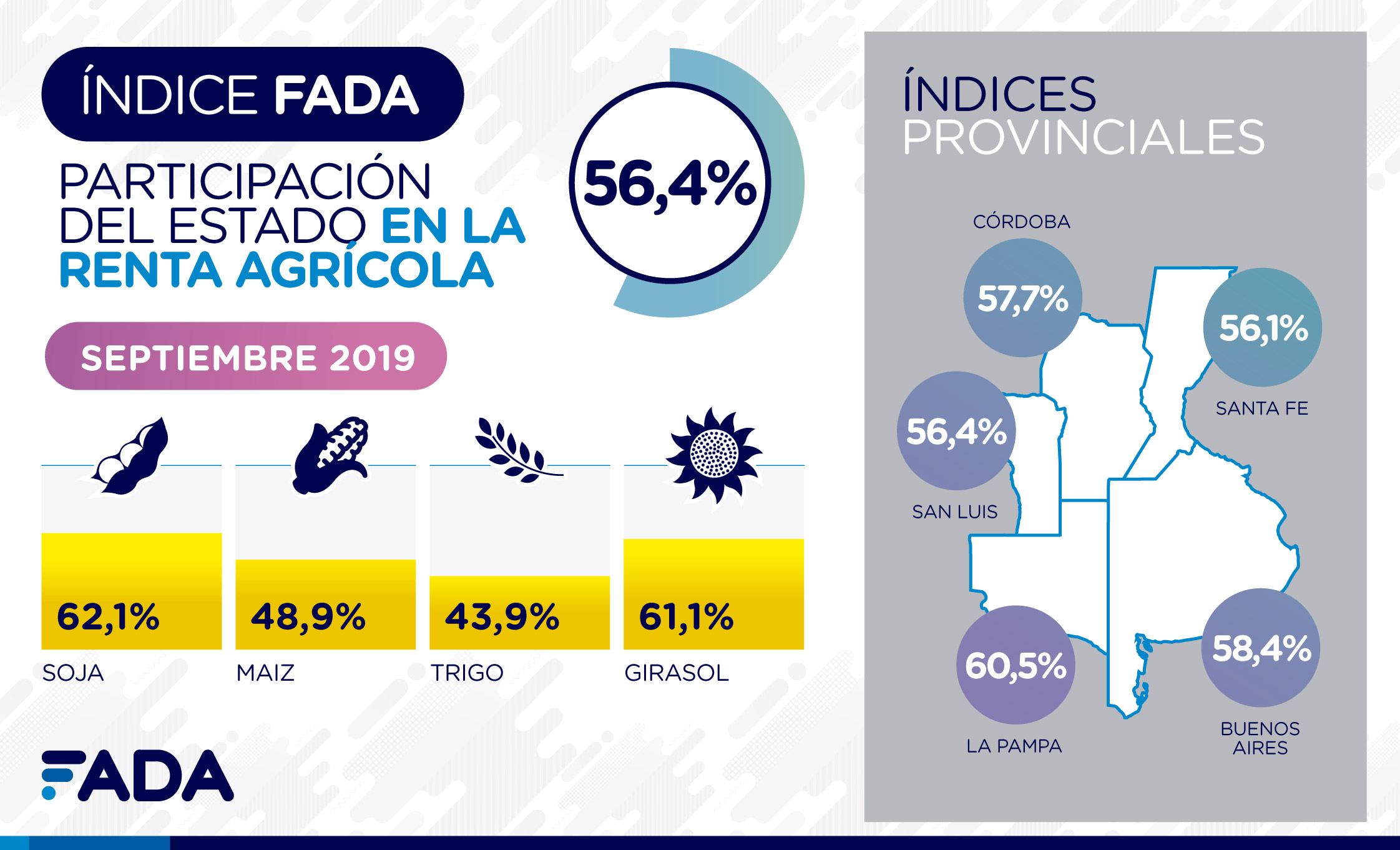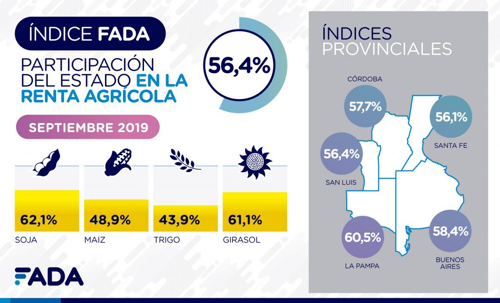 Como cada tres meses, FADA (Fundación Agropecuaria para el Desarrollo de Argentina) presentó su Índice correspondiente al mes de septiembre, el cual reveló que el 56,4% de la renta agrícola se distribuye en distintos niveles del Estado. Es decir que, de cada $100 que genera el campo, $56,4 van a los gobiernos: municipal, provincial o nacional.