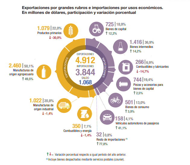 El saldo positivo del intercambio comercial argentino se debe principalmente al aumento de las Manufacturas de Origen Agropecuario (MOA) que aumentaron 49,5%, debido a mayores precios (18,2%) y cantidades (26,4%), alcanzando los 2.460 millones de dólares, y superando el 50% de participación en el total de las ventas al exterior de nuestro país.