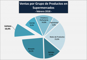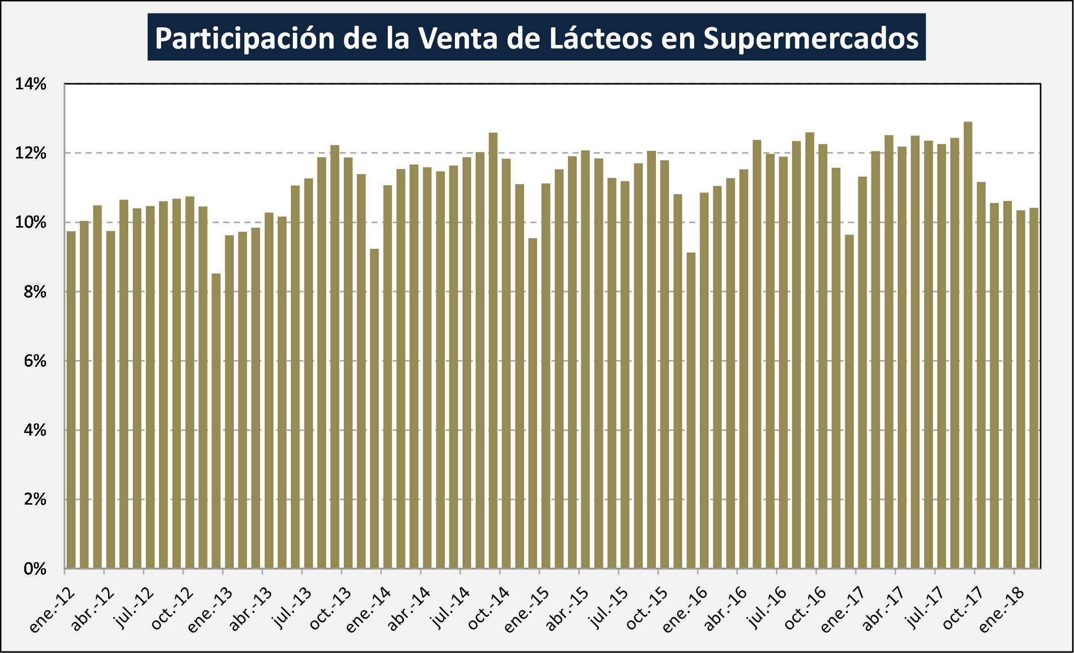 La menor venta de lácteos en términos absolutos, se maximiza con una menor participación de las ventas de productos lácteos en las ventas totales en el canal supermercado. Participación que en algún momento llegó al 13% en la actualidad apenas supera el 10%.