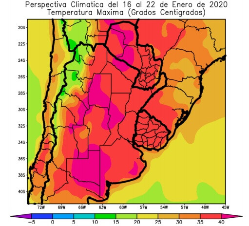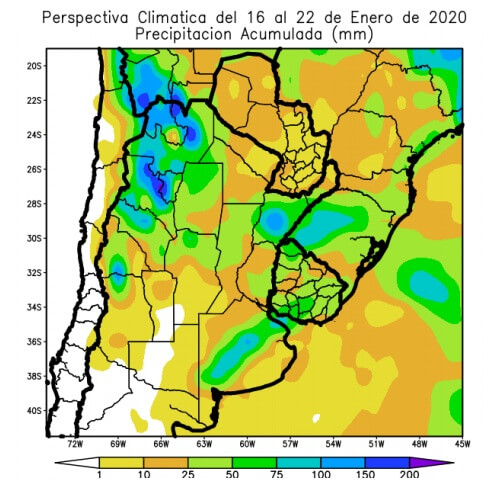 El paso del frente será acompañado por la entrada de vientos frescos y húmedos provenientes del Sur, que provocarán temperaturas mínimas por debajo de lo normal en la mayor parte del área agrícola, a excepción de su porción centro-norte. Aunque aclararon que, no habrá riesgos de heladas en toda el área agrícola.