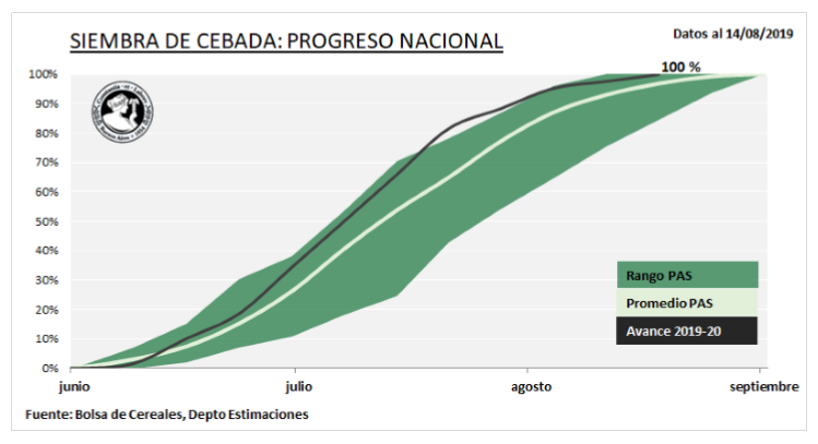 Según informó el Panorama Agrícola Semanal, se dio por concluida la siembra a nivel nacional de cebada. “Luego de registrarse importantes progresos en región bonaerense, se estima que la superficie implantada alcanzó un total de 950.000 hectáreas, reflejando una caída interanual de -5 % sobre el área destinada al cereal de invierno. En paralelo se releva una adecuada oferta hídrica en gran parte del área sembrada, no obstante, luego de varias semanas sin lluvias comienzan a registrarse focos de déficit hídricos sobre el margen oeste de la región agrícola”, destacó el PAS.