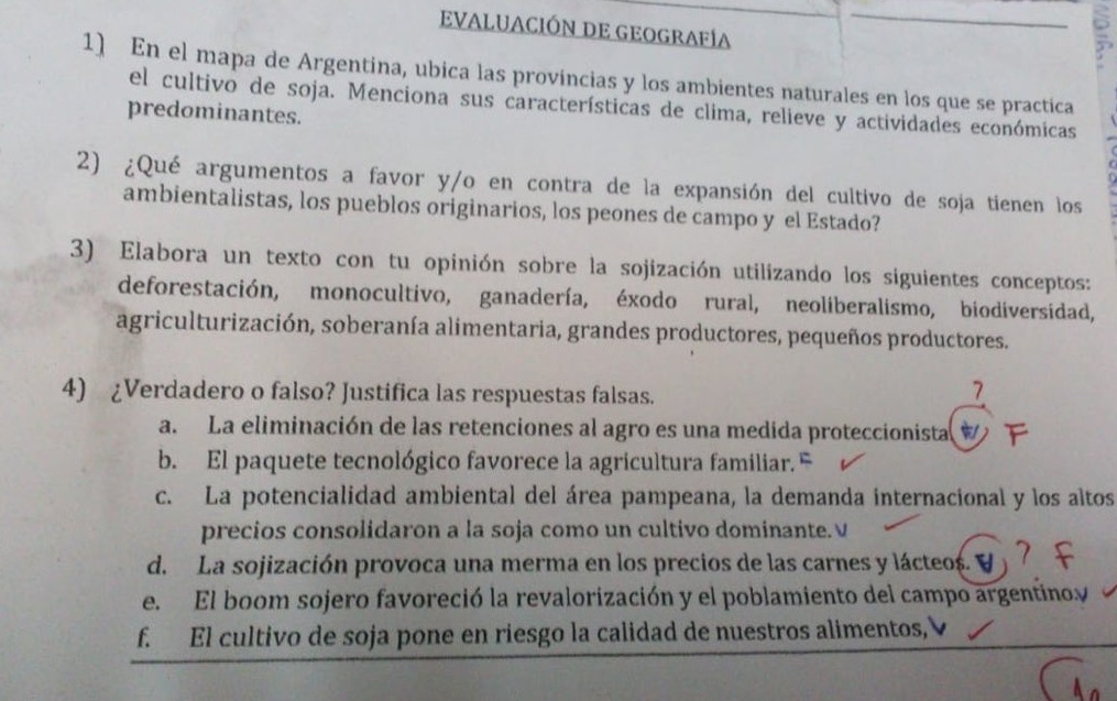 En las últimas horas, en las redes sociales se viralizó un examen de geografía de una escuela secundaria de la Provincia de Buenos Aires con definiciones en contra de la producción de soja.