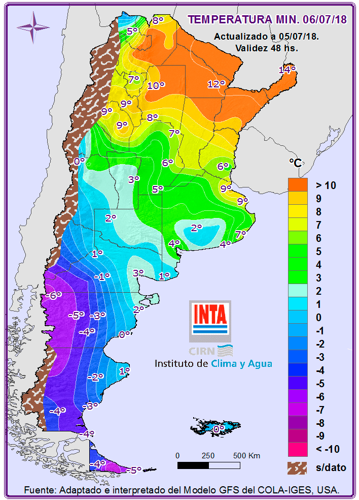 De acuerdo con el pronóstico del Instituto de Clima y Agua del INTA Castelar, este viernes se presentarán condicones nubosas en gran parte del país, al tiempo que las temperaturas irán ascendiendo debido al ingreso de vientos del sector norte. Sin embargo a partir del sábado, el ingreso de una masa de aire frío proveniente del sector sur provocará un marcado descenso de la temperatura y probabilidad de precipitaciones en gran parte del país.