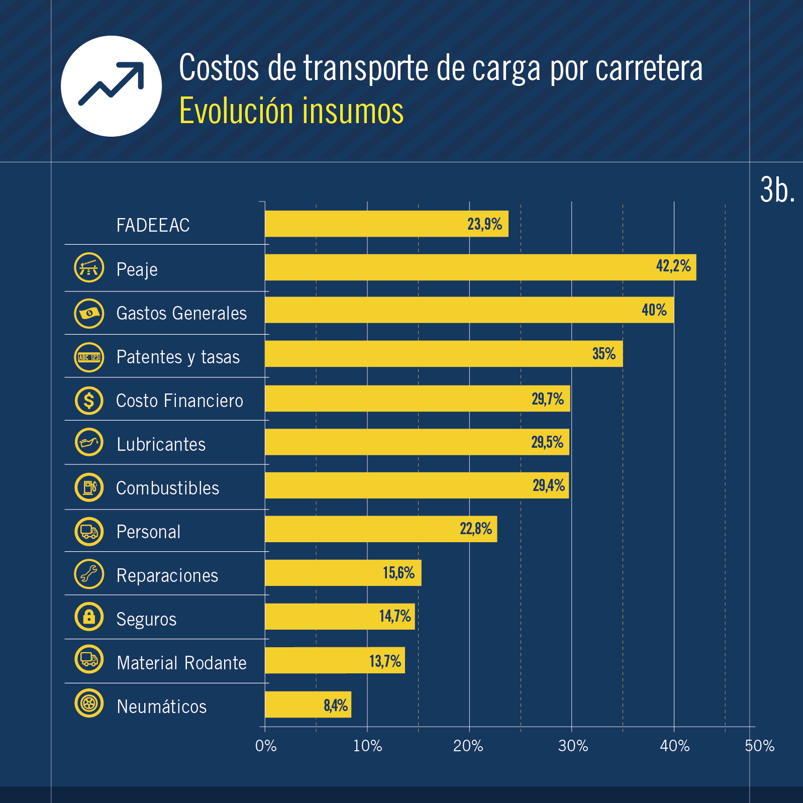 En tanto que “los peajes ascendieron un 1.77 % a partir de los aumentos en la Autopista La Plata-Buenos Aires. Con este valor, trepó un 42.2 % en todo el año, mientras que Gastos Generales un 40, Patentes un 35, y Costo Financiero un 29.7 %. Como contrapartida, los rubros ligados al equipo de transporte verifican subas acumuladas menores”, subraya el informe mensual de Fadeeac.