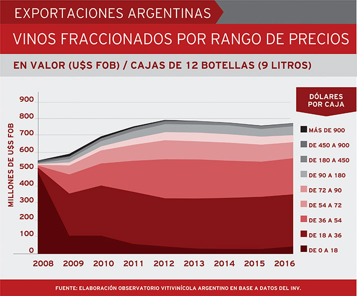 Tras una década, los datos de 2016 permiten ver que más de la mitad del vino fraccionado subió un escalón en el rango de precios, ya que el 51,5% de las cajas de 12 botellas se vendieron entre 18 y 36 dólares (U$S 2 a U$S 4 por unidad).