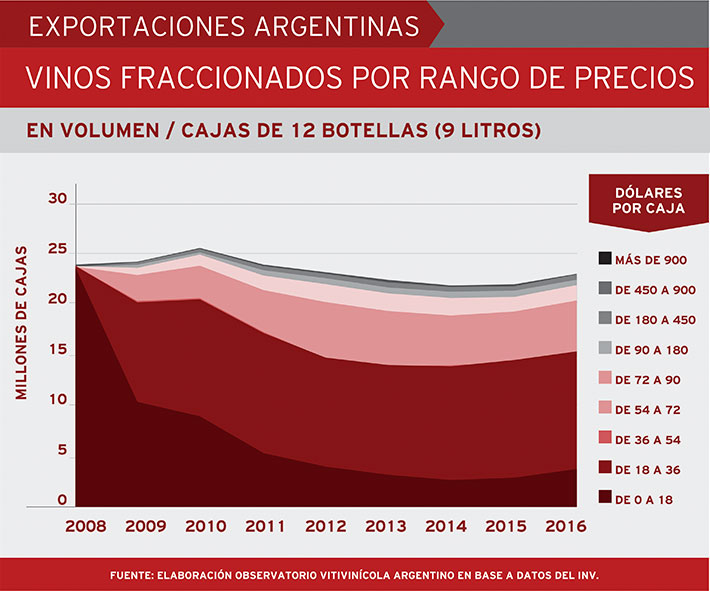 Hace 10 años, más del 90% del vino argentino era exportado en el rango de precio de 0 a 18 dólares por caja (12 botellas o 9 litros), mientras que en 2016 ese segmento sólo concentró el 15% del volumen despachado al exterior y la tendencia muestra que la reducción podría continuar, según los datos que presenta el Observatorio Vitivinícola Argentino.