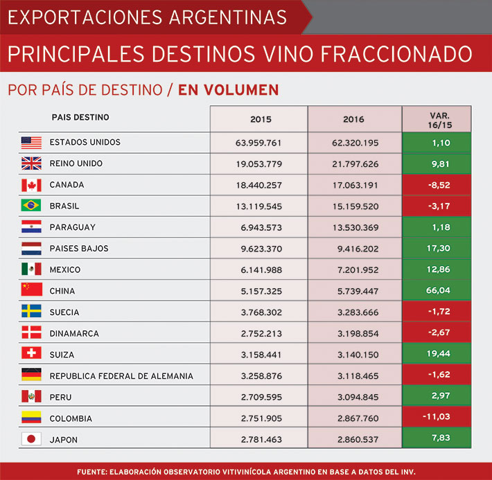 Las exportaciones totales de Argentina durante 2016 tuvieron un crecimiento moderado en valor (0,95%) por los más de 825 millones de dólares que ingresaron al país y una leve caída en los volúmenes (-2,88%), con casi 260 millones de litros vendidos. El precio promedio del litro de vino argentino estuvo a un centavo de alcanzar el punto más alto en su historia exportadora y se posicionó en U$S 3,18 U$S por litro durante el año pasado.