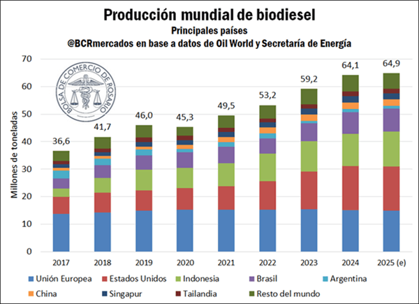 Desde su máximo alcanzado en 2017, la producción argentina de biodiesel cayó al 2024 un 60%, mientras en el mundo creció un 75%