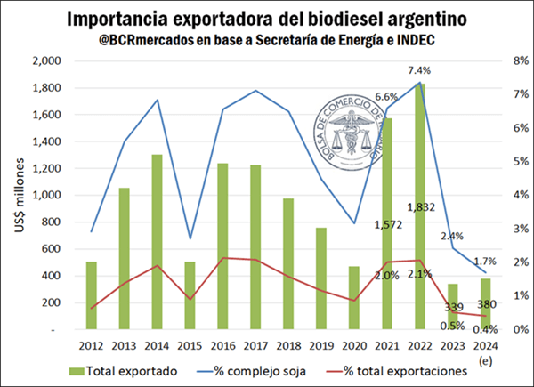 Asimismo, es el segundo producto más exportado por Argentina a la Unión Europea, detrás de la harina de soja. En 2022, el biodiesel generó el 2% de las exportaciones argentinas y el 7,4% de las exportaciones del complejo soja, principal generador de divisas del país.