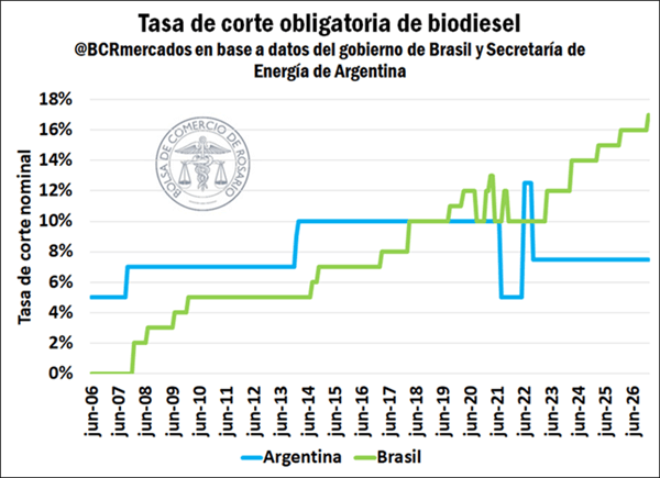 Por otro lado, Brasil ha marcado un sendero de subas progresivas en su tasa de corte de gasoil con biodiesel, lo que lo ha llevado a progresivamente acercarse a Argentina hasta alcanzarla y superarla desde 2021. A partir de marzo de este año, la tasa de corte espera subir un punto más, para ubicarse en el 15%.