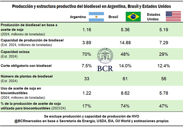 Estas políticas han llevado a estos países a transformar una mayor proporción de su aceite de soja en biodiésel. Con mayores cortes nominales y una marcada política de promoción, tanto en Estados Unidos como en Brasil, la capacidad productiva del biodiésel se aprovecha en una mayor proporción que en Argentina, que tiene hoy un marco normativo de biocombustibles a contramano de las tendencias mundiales, en un esquema que no promueve la competencia, ni mejoras en calidad o inversiones en nuevas tecnologías.