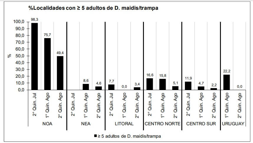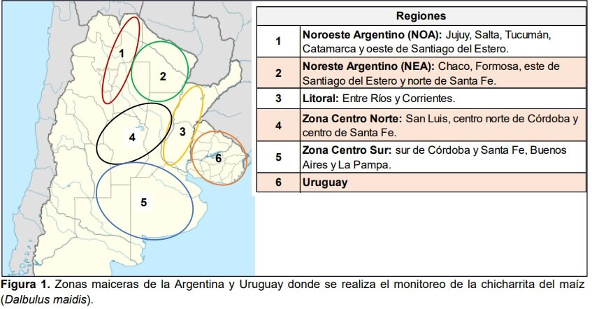 Con este fin, se relevó la captura de adultos machos de chicharrita del maíz en una amplia franja del país, que para este caso se dividió en seis regiones. Con esos datos, se informa sobre el porcentaje de infección estacional.