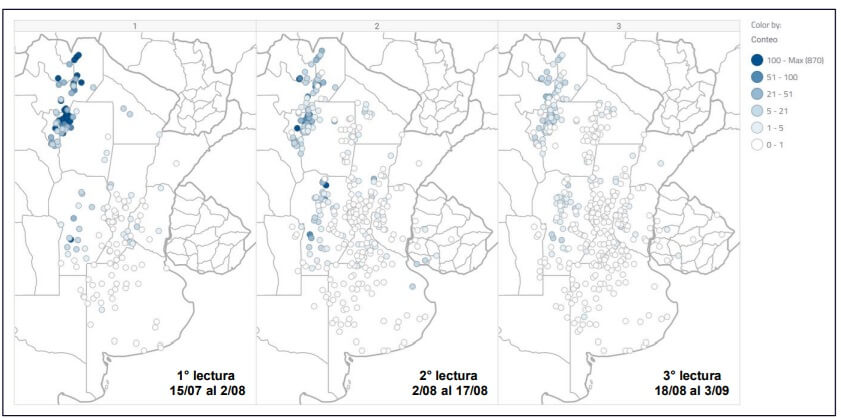 “Los valores detallados en las mismas no hacen referencia al grado de peligrosidad de esta plaga en las localidades relevadas”, aclararon.
