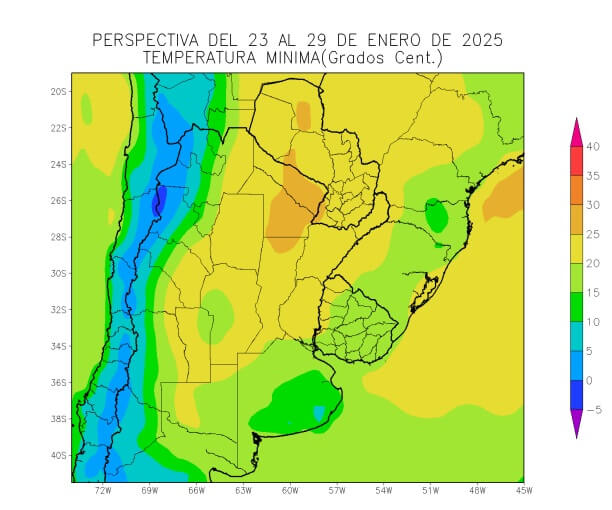 Con respecto a las temperaturas mínimas, el PAC adelantó que en en centro del NOA y Cuyo, sur de la región Pampeana y la mayor parte del Uruguay, estos registros oscilarán entre 15°C y 20°C.
