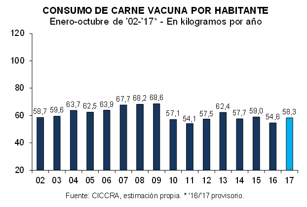 Según el informe de la Cámara de la Industria y Comercio de Carnes y Derivados de la República Argentina (CICCRA) “en enero-octubre de 2017 la industria frigorífica vacuna produjo 2,36 millones de tn r/c/h de carne, volumen que resultó 8,6% superior al registrado en los primeros diez meses de 2016. En términos absolutos, se enviaron al mercado 187.515 tn r/c/h más de carne que en enero-octubre del año pasado”.