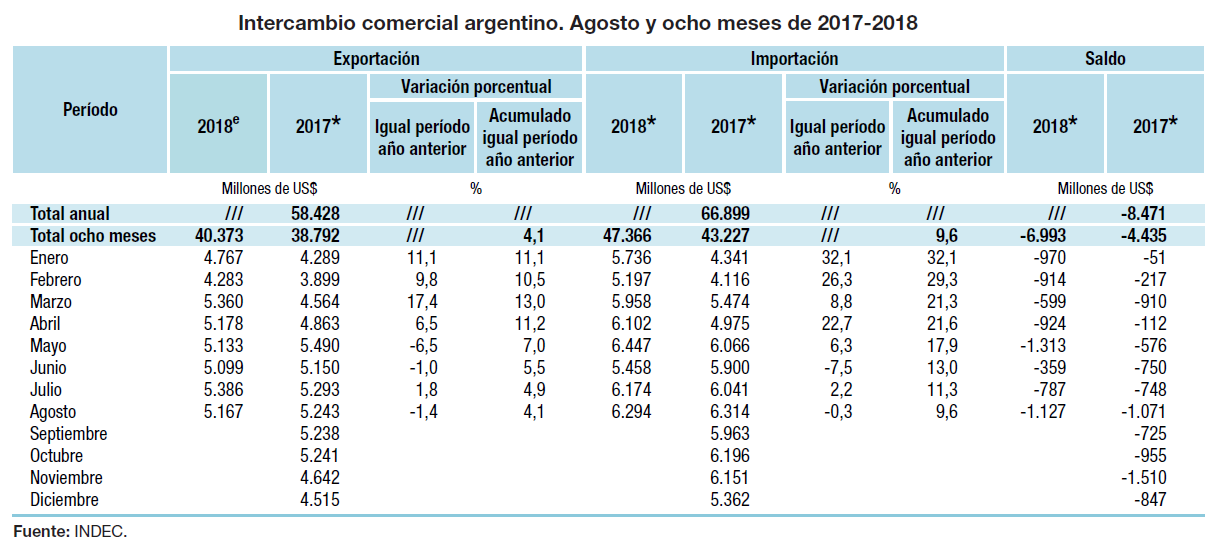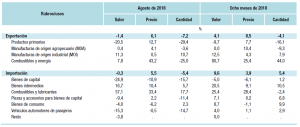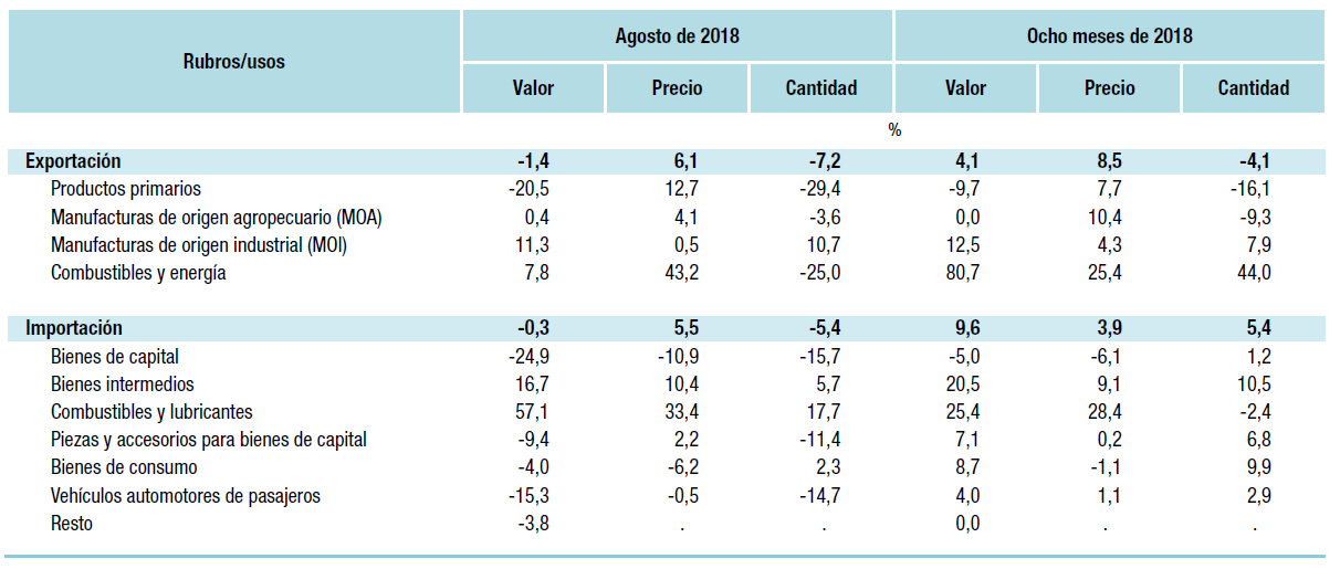 En tanto para las importaciones: “Las importaciones en el mes de agosto disminuyeron 0,3% respecto a igual mes del año anterior, en términos desestacionalizados las importaciones de agosto de 2018 cayeron 0,8% respecto del mes anterior. Los precios subieron 5,5% y las cantidades se contrajeron 5,4%. Las importaciones de bienes de capital cayeron 24,9%, las de bienes intermedios aumentaron 16,7%; las de combustibles y lubricantes aumentaron 57,1%; las de piezas y accesorios para bienes de capital cayeron 9,4%; las de bienes de consumo cayeron 4,0% y las de vehículos automotores de pasajeros cayeron 15,3%”, detalló el Instituto.