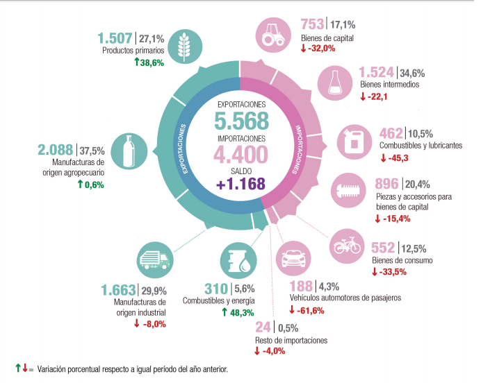 “El superávit comercial fue producto de un aumento en las exportaciones, que se explicó principalmente por un incremento en las ventas de semillas y frutos oleaginosos; carne y despojos comestibles; cereales; y combustibles minerales, aceites minerales y productos de su destilación; y una caída en las importaciones, fundamentalmente, de vehículos terrestres, sus partes y accesorios; combustibles minerales, aceites minerales y productos de su destilación; reactores nucleares, calderas, máquinas, aparatos y artefactos mecánicos y sus partes (capítulos 84 y 85); y semillas y frutos oleaginosos, entre otros”, detalló el INDEC.
