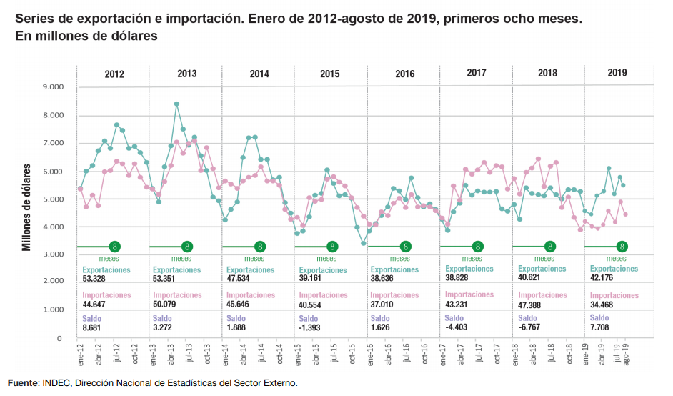 El Instituto Nacional de Estadística y Censos (INDEC) dio a conocer su informe mensual sobre el Intercambio Comercial Argentino (ICA) donde en agosto de 2019, “las exportaciones alcanzaron 5.568 millones de dólares y las importaciones, 4.400 millones de dólares. El intercambio comercial (exportaciones más importaciones) disminuyó 13,2% en relación a igual período del año anterior y alcanzó un valor de 9.968 millones de dólares. La balanza comercial registró un superávit comercial de 1.168 millones de dólares”.