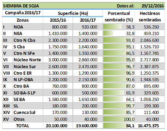 Según el Panorama Agrícola Semanal, “más del 40 % del área aún pendiente son cuadros situados en las regiones NOA y NEA, que transitan plena ventana de siembra y mantienen una adecuada condición hídrica. Sin embargo, otro 19 % del área remanente corresponde a lotes de primera y segunda ubicados en el Sudeste de Buenos Aires. En esta última región, la ventana de siembra se encuentra próxima a finalizar y de no registrarse lluvias dentro de los próximos días deberemos realizar ajustes de superficie que indefectiblemente impactaran sobre nuestra actual proyección nacional área destinada al cultivo”.