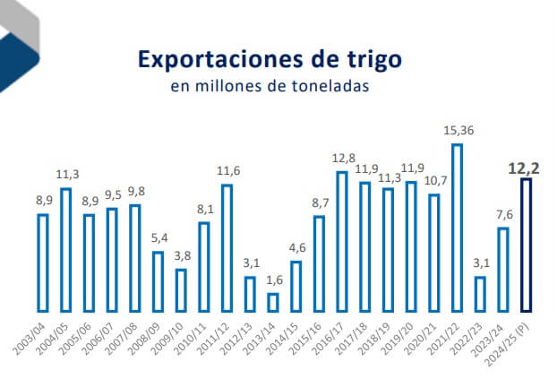 Con respecto al comercio exterior, se espera que las exportaciones del complejo trigo se recuperen un 49% y genere un ingreso de divisas por U$S 2.910 millones, con despachos estimados en 12,2 millones de toneladas.