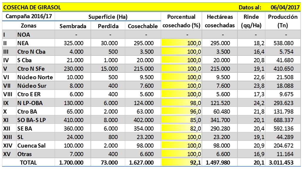Según la Bolsa de Cereales de Buenos Aires, “durante la última semana, si bien se registraron nuevas precipitaciones sobre el norte de La Pampa, oeste y centro de Buenos Aires, la cosecha de girasol avanzó sobre la franja central del país, manteniendo un retraso interanual de – 3,1 puntos porcentuales. Los mayores progresos de recolección se relevaron sobre el sur de Buenos Aires, región que aún concentra una gran proporción de los lotes en madurez fisiológica. En consecuencia, el progreso nacional de cosecha alcanzó el 92,1 % de la superficie apta, con un rinde medio que ascendió a 20,1 qq/Ha y elevó el volumen parcial acumulado a más de 3 MTn. Los rendimientos relevados sobre los núcleos girasoleros del sur bonaerense continúan registrando una gran variabilidad en función de las precipitaciones acumuladas durante las etapas críticas de floración y llenado de grano. De todas maneras, sobre el final de la campaña se espera alcanzar la proyección de producción de 3.300.000 toneladas, cifra que reflejaría un incremento interanual del 32 % (Producción 2015/16: 2,5 MTn)”.