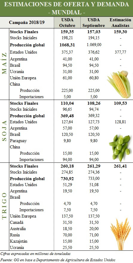 “El trigo cerró ligeramente en terreno negativo, alrededor de 186 U$S/tn. El nuevo informe del USDA, propuso un escenario de fundamentos bajistas en el plano local. En detalle, el organismo elevó ligeramente la estimación de stocks finales del cereal para la campaña (26,03 mill. tn.). Esto vendría explicado por un ligero aumento en la producción (51,29 mill. tn.) y una leve caída en la demanda interna (31,08 mill. tn.)”, asegura GG sobre los meracdos.