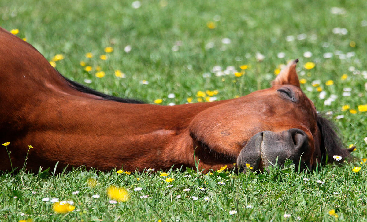 Para conseguir un sueño profundo necesitan tumbarse. Y los caballos solo alcanzan el sueño profundo o bien sobre sus cuatro patas recogidas o bien de costado echados en el suelo. Eso sí, es raro, pero si se sienten muy cómodos y relajados se tirarán en el suelo para descansar.