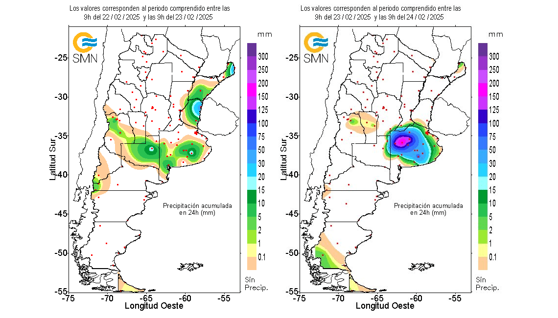 24 FEB | 🌧️ Las intensas precipitaciones en el centro de Bs As, dejaron valores > a 100 mm en varias ciudades en la últimas 24h