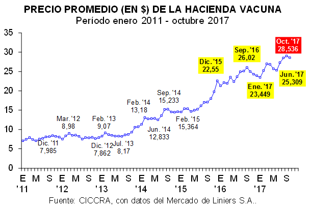 Según el informe de la Cámara de la Industria y Comercio de Carnes y Derivados de la República Argentina (CICCRA), “el fuerte crecimiento de los envíos de hacienda a faena durante octubre interrumpió el recorrido alcista del precio promedio del kilo vivo. En el último mes el valor de la hacienda comercializada a través del Mercado de Liniers registró una caída de 1,6% con relación a septiembre pasado, explicada por bajas en todas las categorías de animales, y el precio promedio se ubicó en $ 28,536 por kilo vivo. En tanto, en términos interanuales experimentó una suba de 14,2%”.
