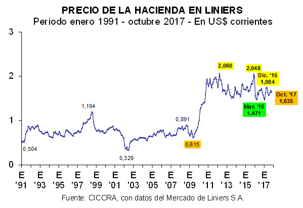 Sin título“El precio promedio de la hacienda en pie expresado en dólares estadounidenses bajó a US$ 1,635 en octubre pasado. La caída fue de 2,7% y, de esta manera, retornó al nivel alcanzado en agosto del corriente año (-1,6% cayó el valor de la hacienda en moneda nacional vs. 1,2% subió la cotización del dólar). En comparación con octubre de 2016, el precio promedio de la hacienda en dólares disminuyó 0,6% (14,2% vs. 14,9%)”, detalló la Cámara.