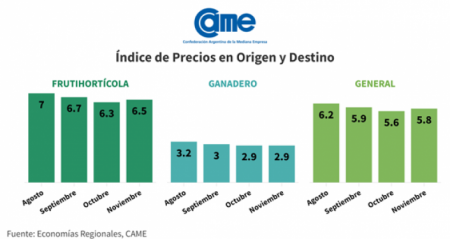 La brecha de precios para el promedio de los 24 principales productos agropecuarios que participan de la mesa familiar y que sigue mensualmente la Confederación Argentina de la Mediana Empresa registró una nueva suba, del 2,9%, en el mes de noviembre.
