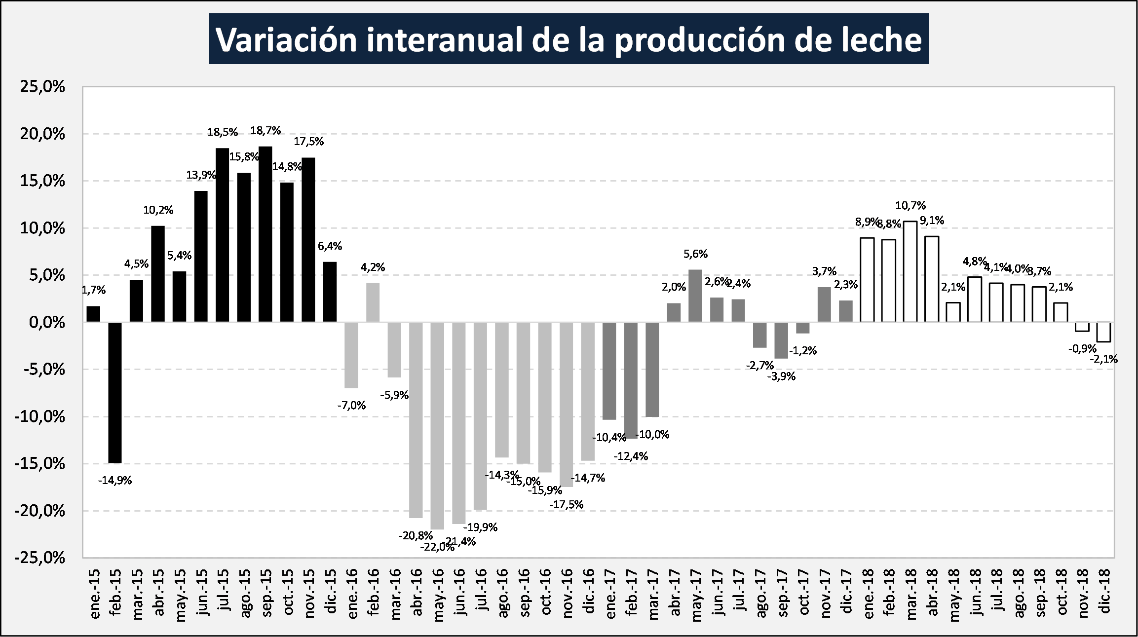 Un informe del Observatorio de la Cadena Láctea Argentina (OCLA) señaló que la producción de leche cayó 2,1% interanual en diciembre al alcanzar los 910,6 millones de litros.