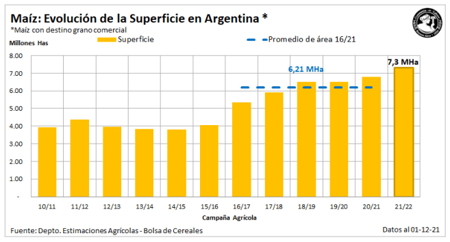 La Bolsa de Cereales de Buenos Aires, a través del Panorama Agrícola Semanal, informó que se eleva en 200.000 hectáreas la estimación de siembra de maíz argentino con destino grano comercial, con lo cual se implantarían 7,3 millones de hectáreas en esta campaña en curso.
