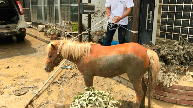La yegua miniatura era mascota de una residencia de ancianos de la ciudad de Kurashiki. Días previos a las inundaciones, Leaf tuvo un potrillo que lamentablemente, no pudo salvarse.El ejemplar tiene 9 años y pasó un par de días en el techo de una vivienda, hasta que finalmente pudo ser recatada por los socorristas de una asociación humanitaria.