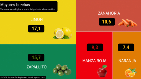 De acuerdo a los datos de la canasta IPOD (Índice de Precios entre Origen-Destino) que confecciona la Confederación de la Mediana Empresa cada mes, en agosto, el consumidor pagó 5,9 veces más de lo que cobró el productor para frutas y hortalizas, mientras que el precio se multiplicó por 2,8 veces para la leche, los huevos, el pollo, la carne de novillo y la de cerdo, desde que salieron del campo hasta que llegaron a la góndola.