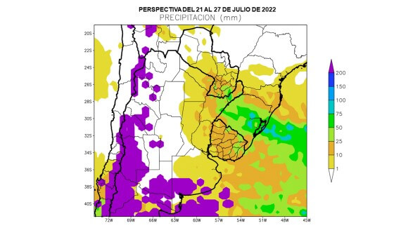 El pronóstico semanal de la Bolsa de Cereales de Buenos Aires no trae buenas noticias al respecto: en medio de condiciones que cambiarán desde los vientos del trópico a una masa de aire polar, solo se prevén precipitaciones de consideración en el extremo nordeste del país (parte de Corrientes y Misiones).