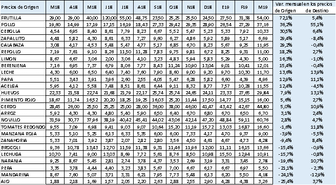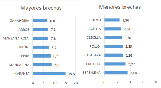 Los productos con menores brechas en el mes, en tanto, fueron el huevo con una multiplicación de 2,36 veces, la acelga con 2,61 veces, la cebolla con 2,7 veces, la carne de pollo con 2,83 veces, y la calabaza con 2,93 veces. Estos cinco productos se mantuvieron durante el mes con brechas menores a tres veces.