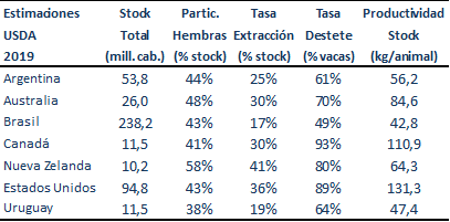 Pero como todo dato siempre resulta más interesante analizarlo en términos relativos, nos hemos apartado de las cifras oficiales para tomar una serie más amplia del Departamento de Agricultura de los Estados Unidos (USDA) que nos permita comparar estos mismos indicadores para los principales países productores de ganado bovino.