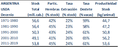 Claramente, un stock relativamente estabilizado durante cinco décadas no es más que el resultado de un nivel de procreo o destete estancado y tasas de extracción de equilibrio que debieron necesariamente estabilizarse para sostener dicho stock. En el caso de Brasil, la duplicación de su stock en los últimos 50 años fue posible al mantener su tasa de extracción estabilizada pero aumentando conjuntamente el porcentaje de hembras en stock (del 41% al 52%) y el porcentaje de destete (del 38% al 44%), más allá de controlar otros indicadores como la mortandad.