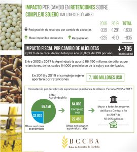 “El impacto directo de la disminución de las retenciones al poroto, al aceite y la harina de soja asciende a USD 451 millones para 2018 y USD 1.403 millones para 2019. Considerando los ingresos que se producirán por la retención aplicada al biodiesel, el complejo sojero en su totalidad dejará de aportar ingresos fiscales por USD 1.630 millones en ambos años”, aseguró la Bolsa de Cereales de Córdoba.