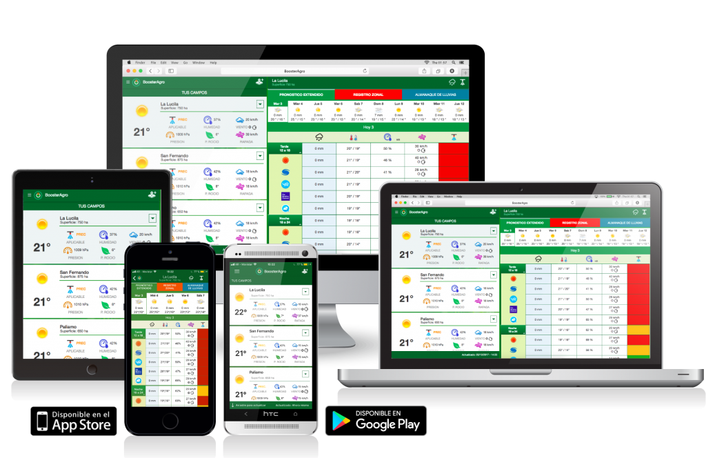 BoosterAgro a diferencia de las demásaplicaciones de clima genérico, pone a disposición del usuario información climática en las coordenadas exactas de su campo. Además, el usuario puede consultar un registro histórico de temperaturas medias, lluvias acumuladas zonales, sincronizarlo con su planilla de lluvias yvisualizar de forma remota las condiciones actuales de su campo, sin necesidad de instalar un equipo ó sensor.