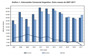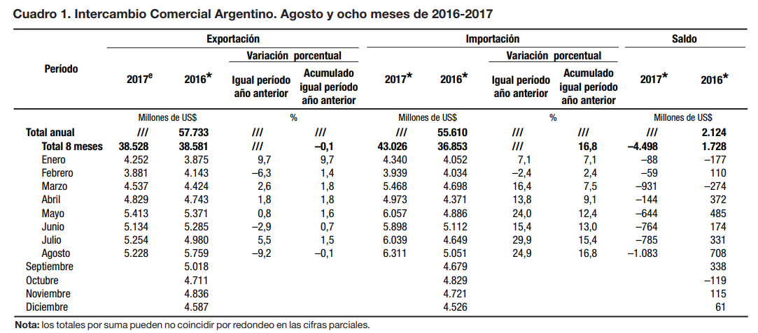 “En agosto de 2017 las exportaciones alcanzaron 5.228 millones de dólares y las importaciones 6.311 millones de dólares. El déficit en la balanza comercial fue de 1.083 millones de dólares”, señala el Informe Técnico vol. 1 nº 174, de Comercio exterior vol. 1 nº 16, denominado Intercambio Comercial Argentino, con las Cifras estimadas de agosto de 2017 que elabora mensualmente el Instituto Nacional de Estadística y Censos (INDEC).